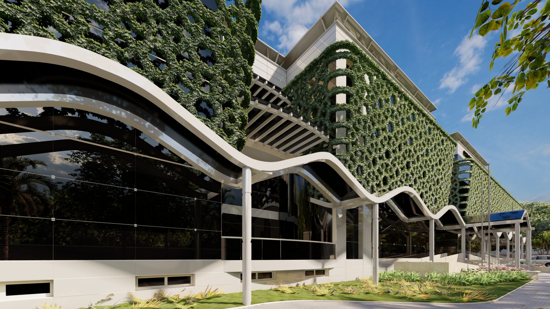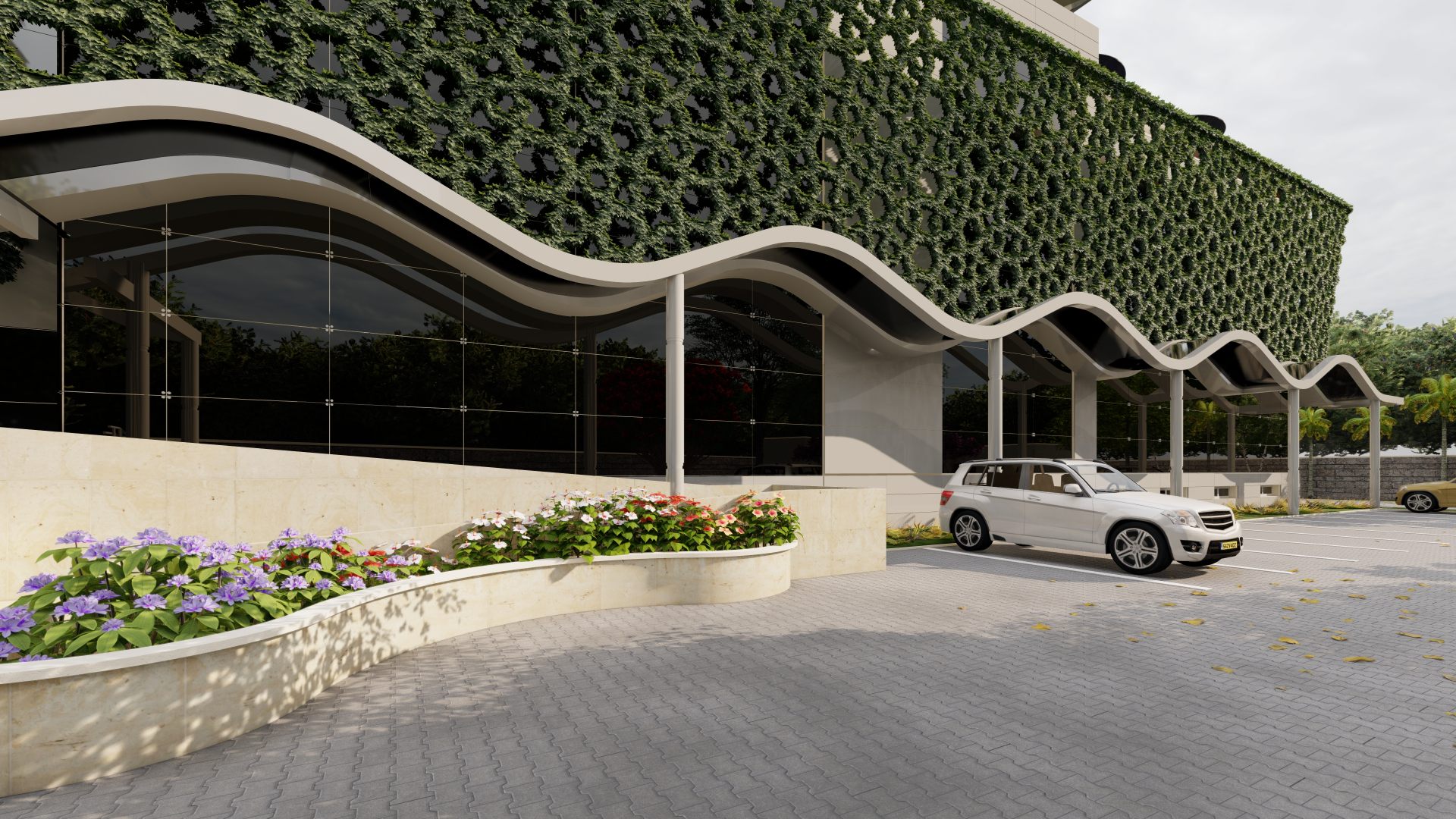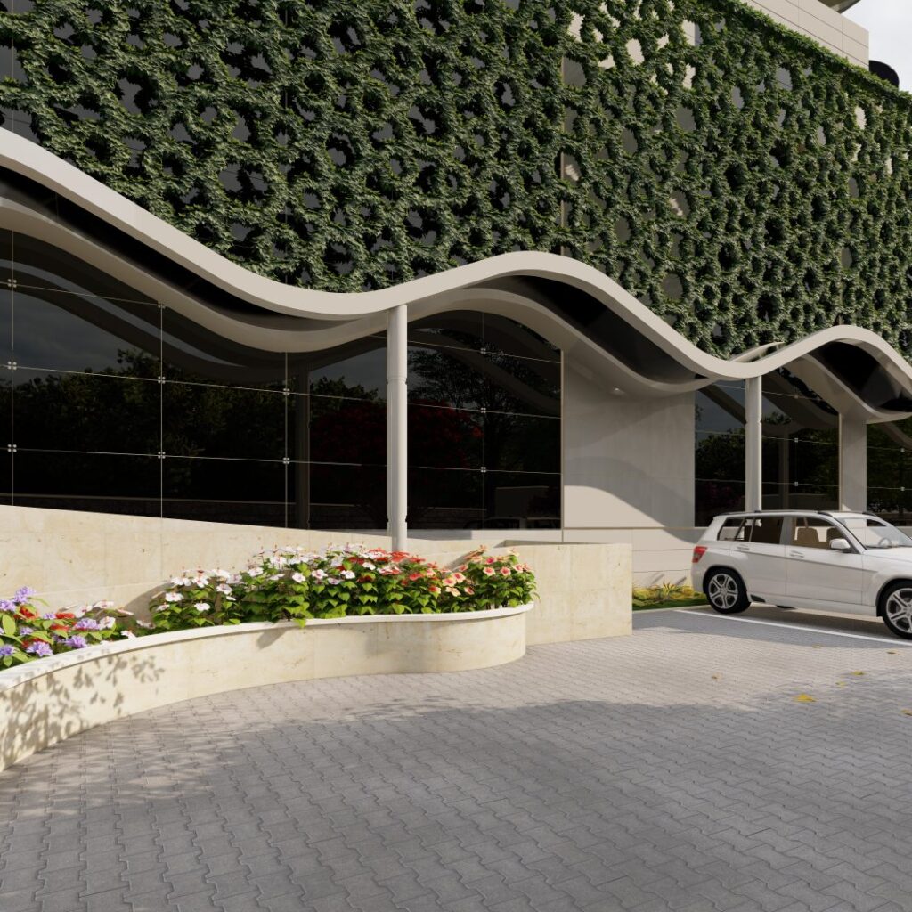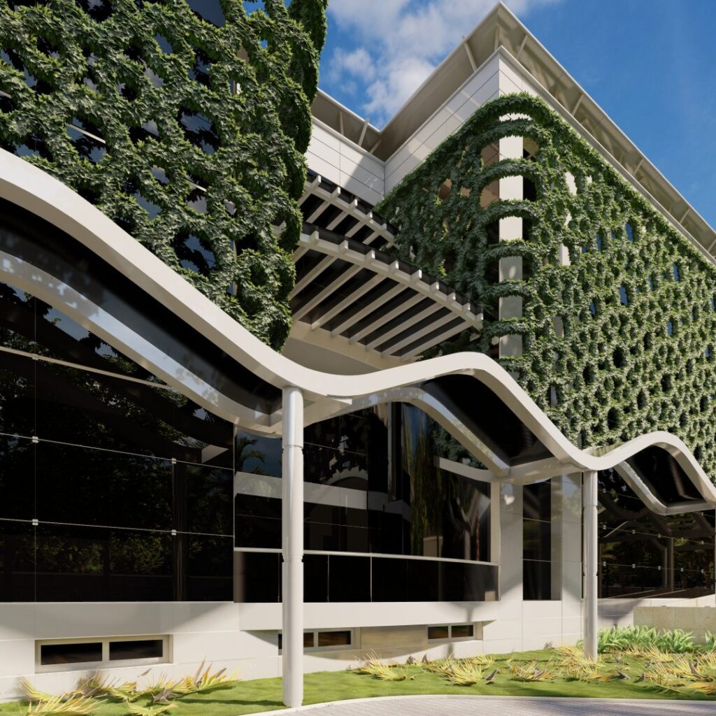 This project was designed as an ultra-modern office building with a green wall wrapping around the façade.