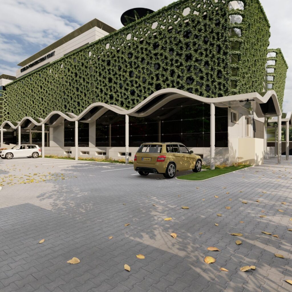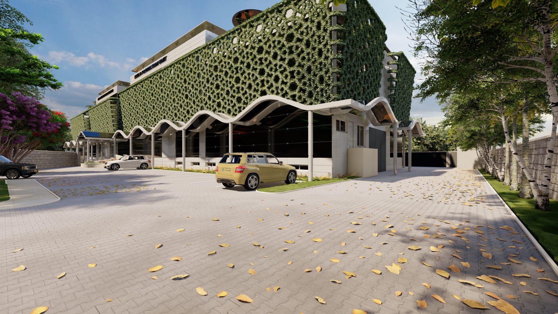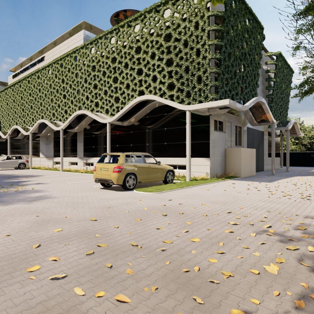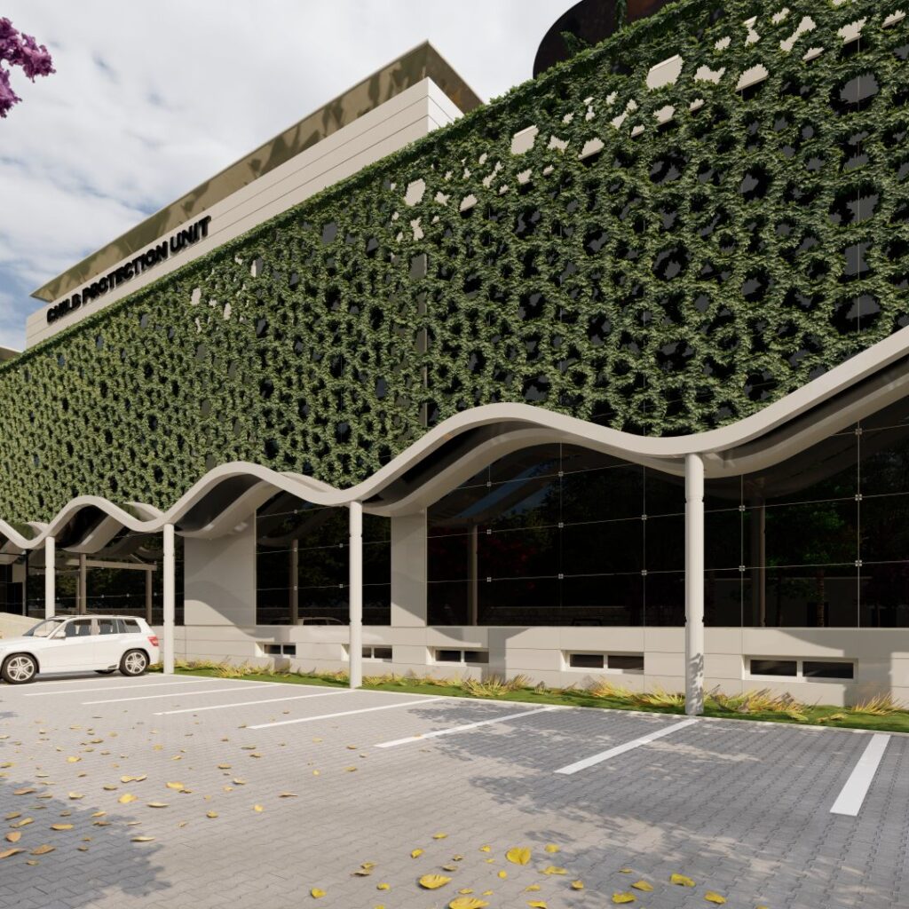 This project was designed as an ultra-modern office building with a green wall wrapping around the façade.