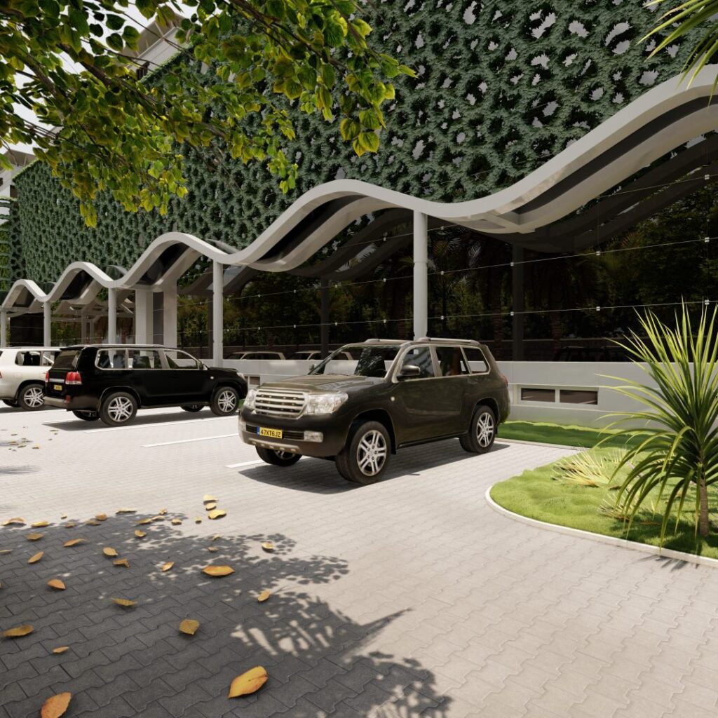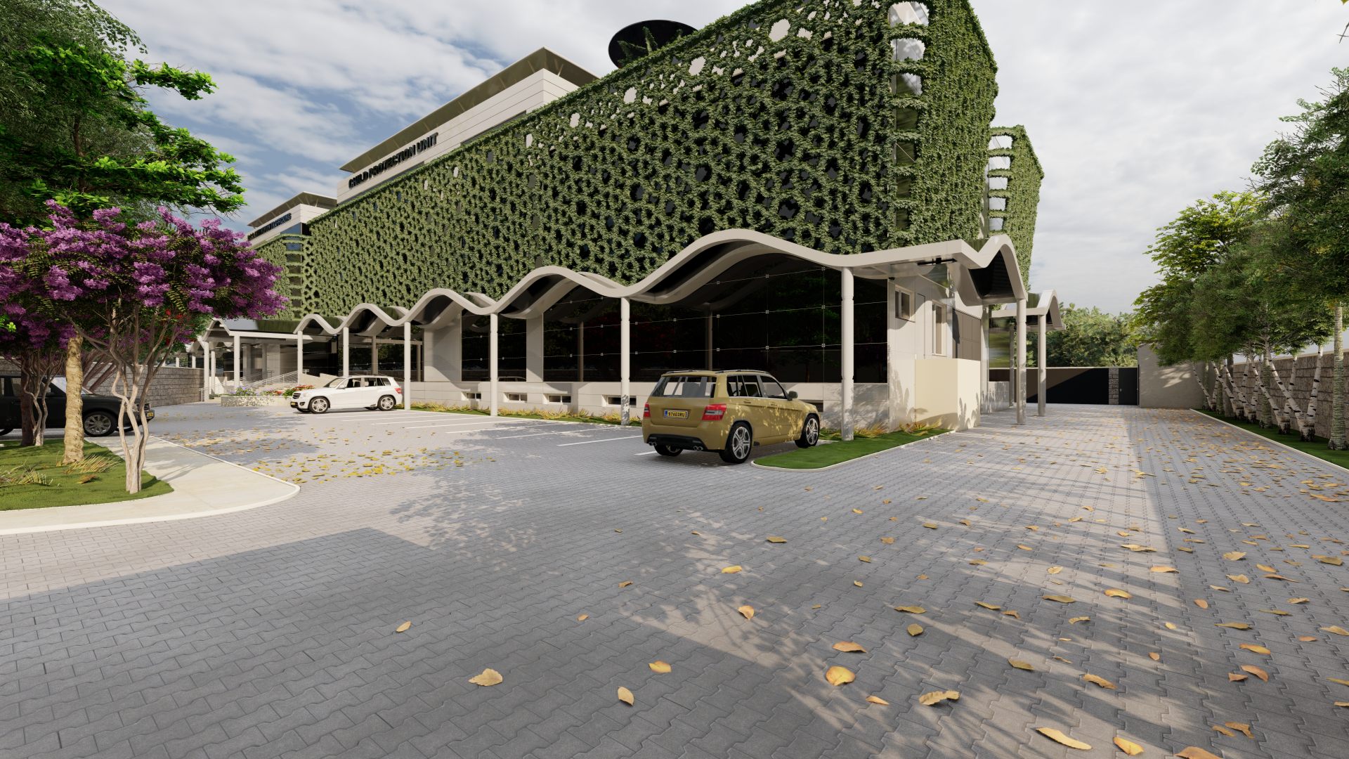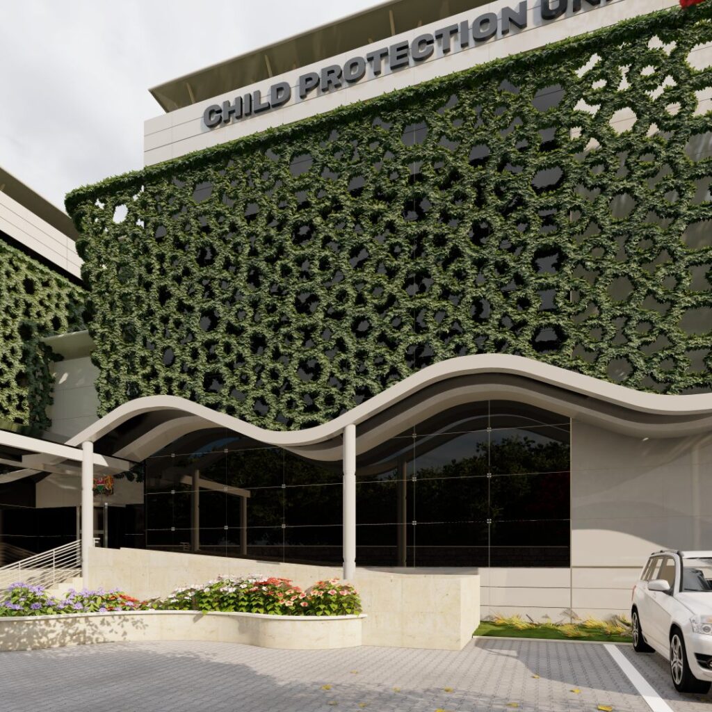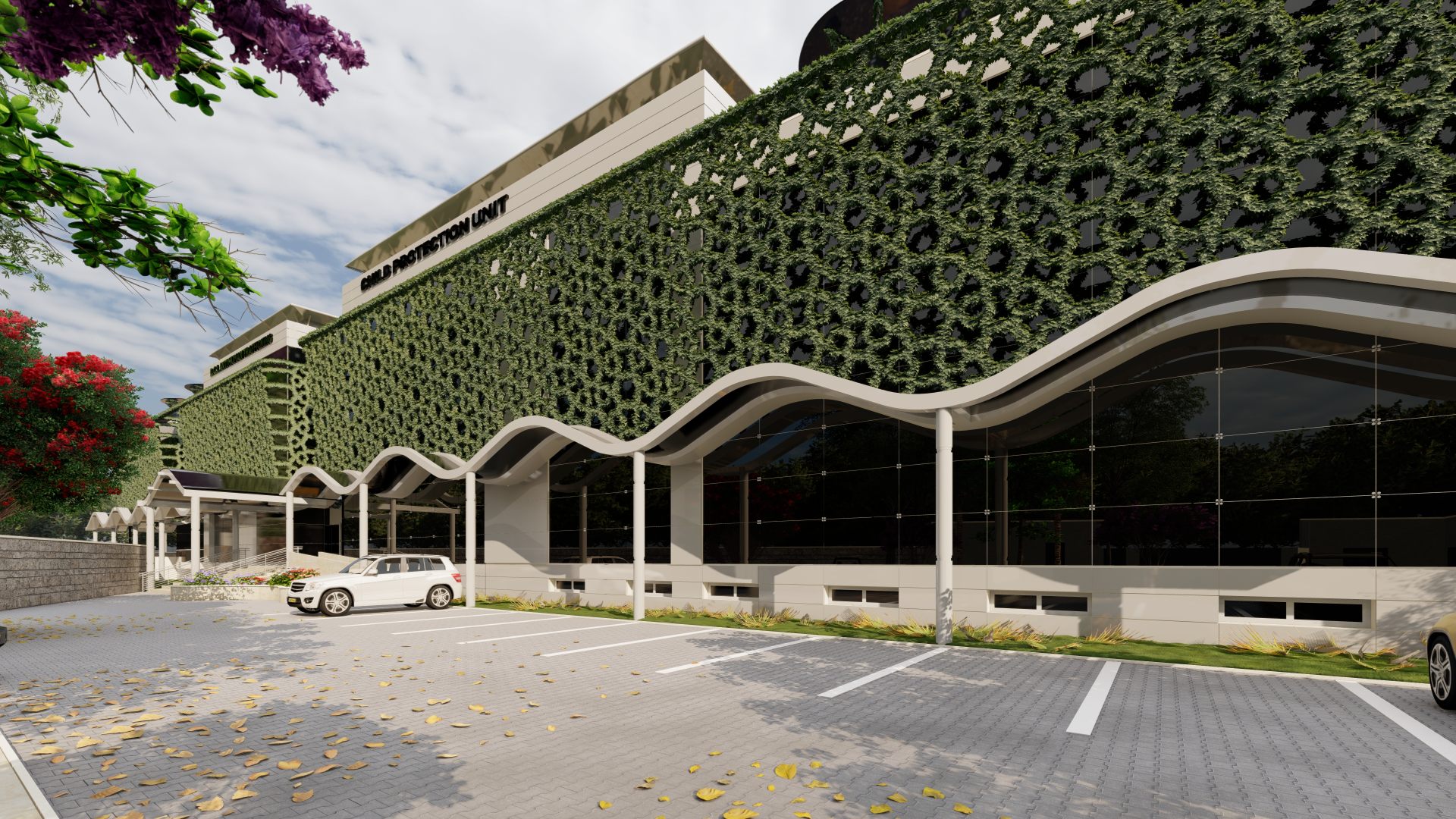 This project was designed as an ultra-modern office building with a green wall wrapping around the façade.